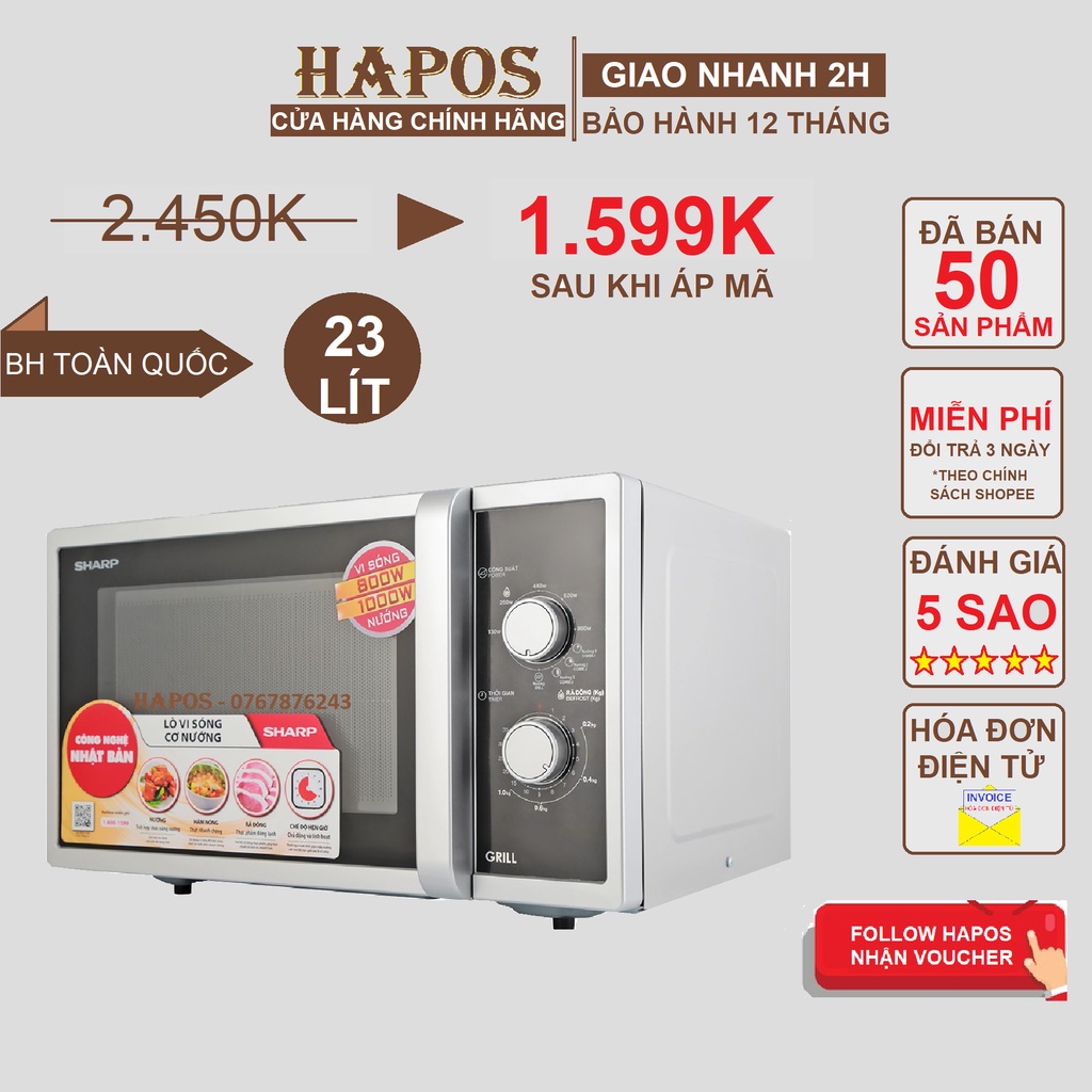Freeship- Lò vi sóng Sharp 23 Lít có nướng Viba 800W Nướng 1000W núm xoay cơ - HAPOS phân phối chính hãng mua tại đây